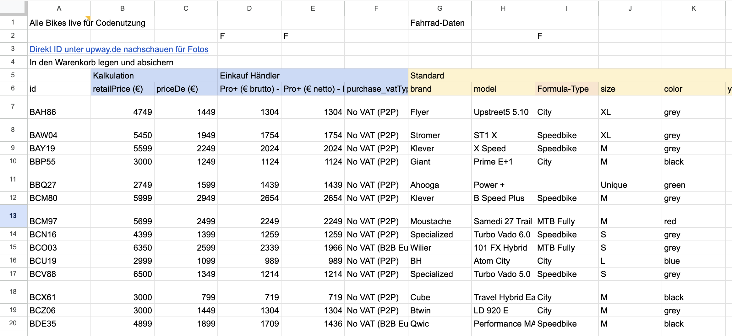 Falls ihr anstatt von dem Aussuchen auf upway.de lieber eine Liste mit allen aktuellen Bikes haben mögt. Dort sind alle Bikes, die gerade für die Codenutzung verfügbar sind einzusehen.