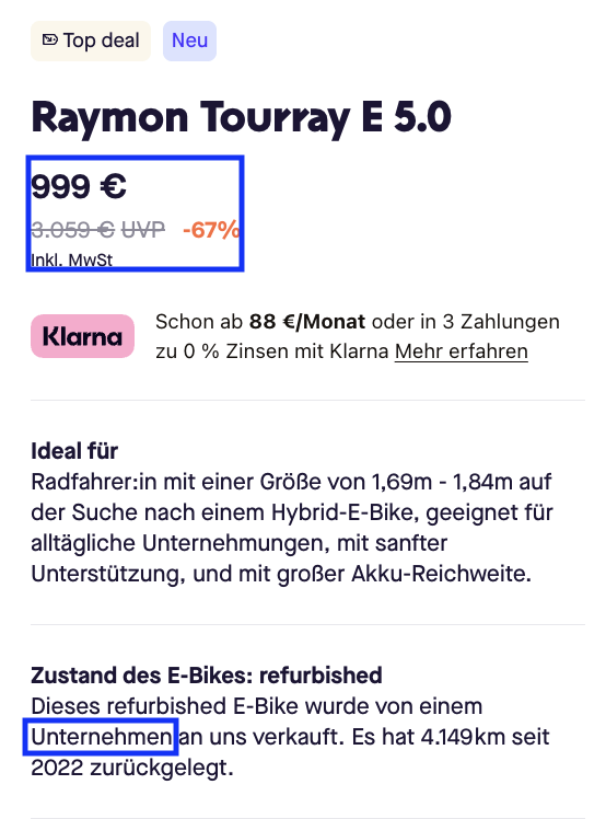 Je nach Herkunft des E-Bikes gilt beim Einkauf aber eine unterschiedliche Mehrwertsteuer. Achtet dabei auf die Angabe A) Privatperson oder B) Unternehmen im Verkaufsfenster des E-Bikes!
